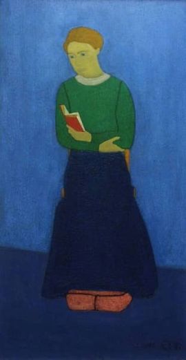 Ik ben gecharmeerd van het schilderij, de eenvoud en de subtiele details (zit ze of staat ze) gecombineerd met de grote zeggingskracht spreekt me zeer aan.